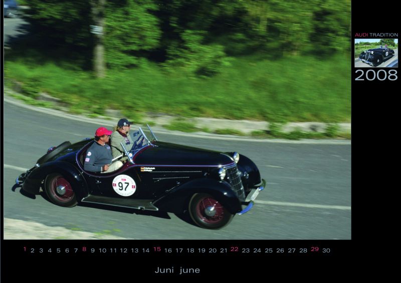 Der Audi Tradition Kalender 2008 wird alle Farbigkeit der Mille Miglia widerspiegeln und somit einen Kontrapunkt zum Schwarz-Stil der 2007-Ausgabe bilden. Alle Freunde der Audi Tradition dürfen sich auf ein Werk im Großformat 60 mal 43 Zentimeter freuen, das im aufwändigen Fünffarben-Druck mit partieller Lackierung hergestellt wird. Der Kalender ist exklusiv im Museumsladen des Audi museum mobile (museumsladen@audi.de) zu einem Preis von 29,90 Euro erhältlich.