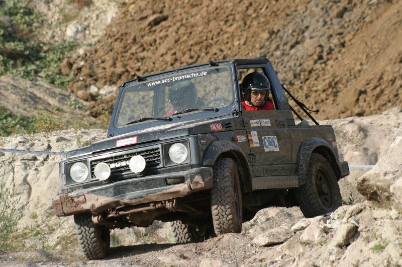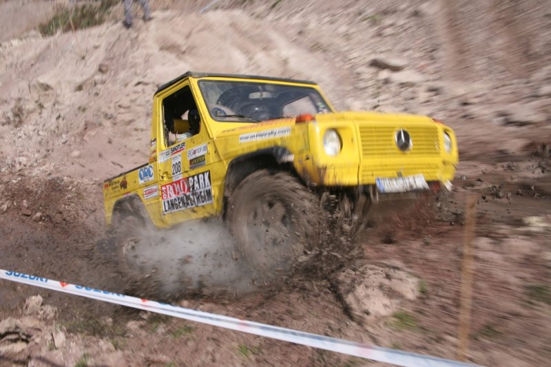 DGM: 7. Lauf in Gschwend – Entscheidung mit Rekordbeteiligung / Seite 2Ebenfalls noch offen war die Entscheidung in der Klasse Original. Auch hier hoffe ein Mitglied des SCC Bramsche auf den Platz in der Mitte des Podiums. Direkter Gegner von Josef Rosemann war Dominik Keuper von den „4x4 Schlammtigern Wiesbach Saar“. Hier entschied sich der Titelkampf in der Sektion 2. Die Steilabfahrt meisterte Dominik noch, doch in der Anfahrt zum dritten Tor kippte sein LJ 80 um und er kassierte einen teuren Abbruch. Josef hingegen fuhr alle zehn Sektionen zu Ende und wurde mit großem Abstand Tagesieger und damit Deutscher Meister. Den Stunt des Tages lieferte Klaus Hofmockel ebenfalls in der Sektion 2. Wo Dominik noch heil die Abfahrt herunterkam, rollte sich Klaus samt überraschtem Beifahrer Wolfgang Fröls um 360° ab. Der gelbe Mercedes G landete wieder auf allen vier Rädern und nach einer Schrecksekunde ging es dann weiter – unter dem Applaus der Zuschauer. Doch nicht lang. Der G war offenbar müde und legte sich wie Dominiks LJ vor dem dritten Tor auf die Seite. Abends im Festzelt wurde Klaus dann immer noch von vielen angesprochen „Hey, du bist doch der mit dem gelben G? Cooler Stunt!“ Wenigstens ein bisschen Anerkennung nach einer Vorstellung mit Panne.