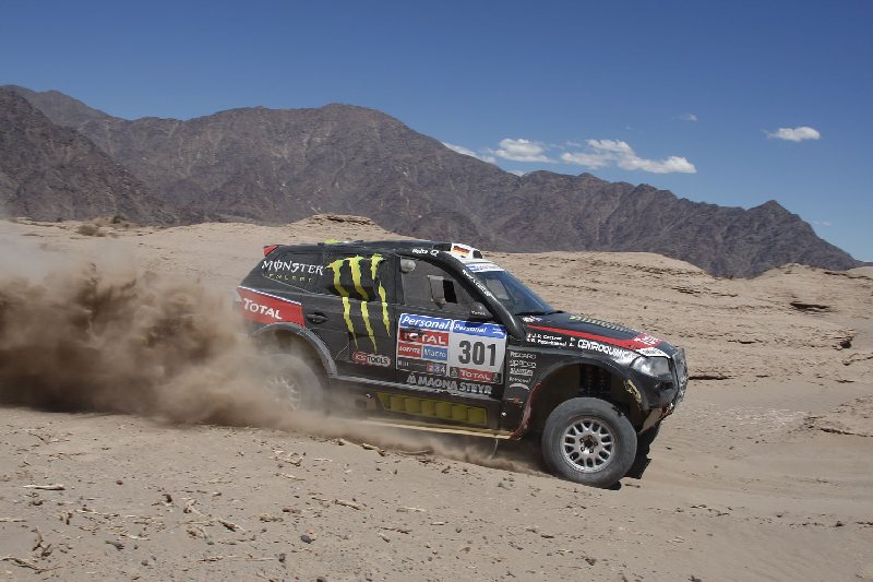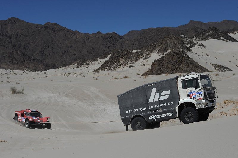 Das HS RallyeTeam dagegen wurde auf der zehnten Etappe der Rallye Dakar vom Pech verfolgt: Der SMG-Buggy von Matthias Kahle und Thomas Schünemann ging nach rund 15 Kilometern in der Fiambalá-Wüste einfach aus. Die Deutschen versuchten mehrfach, den Motor wieder zu starten, doch jedes Mal sprang nach wenigen Momenten eine Sicherung heraus und legte den Buggy wieder lahm. Das Elektronikproblem ließ sich an Ort und Stelle nicht lösen, so musste der rote Wüstenrenner die restlichen 160 Kilometer bis ins Ziel der Etappe vom teameigenen T4-Racetruck abgeschleppt werden. Im Biwak will das Team versuchen, den Fehler zu beheben, um die Rallye fortsetzen zu können.