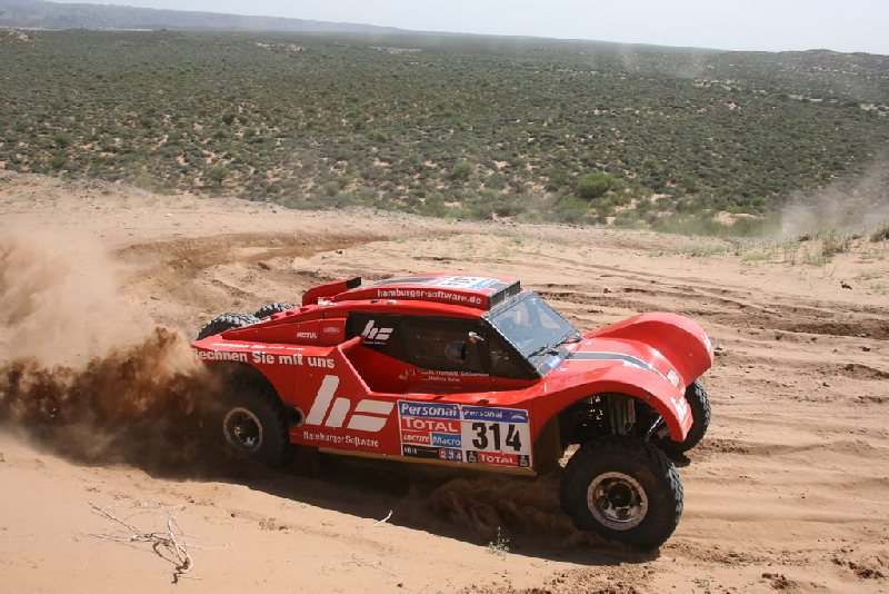 Platz zehn heute, Platz zehn insgesamt und der zehnte Tagessieg in der Buggy-Kategorie: Matthias Kahle und Thomas Schünemann haben sich für die Schlussetappe eine gute Ausgangsposition verschafft. Die Piloten des SMG-Buggy lieferten sich auf der zwölften Wertungsprüfung ein packendes Kopf-an-Kopf-Duell mit ihrem Verfolger Eric van Loon (Mitsubishi Racing Lancer) und waren am Ende exakt sechs Sekunden schneller als der Niederländer. Damit gehen Kahle/Schünemann mit einem Vorsprung von 14:53 Minuten auf den Elftplatzierten in die Schlussetappe.