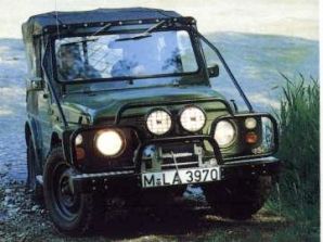 Suzuki LJ 80, 1979 - 83 - Bonsai! Eljot, der Würzige - Seite 6Dann ein "Chasseur" für den jagenden Landadel, natürlich im dezenten "huntergrün" (auch das rammschützende Rohrwerk) mit khakifarbener Plane, Seilwinde und Gewehrständer. Halali. Weiter ging die Jagd nach Kunden schlussendlich im Todesjahr des Eljot,