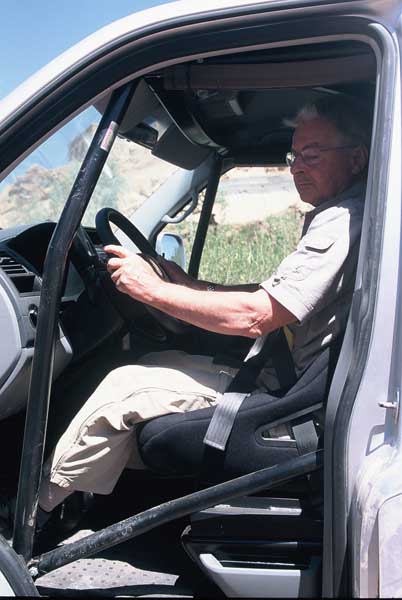 Und innen viel nacktes Blech, Überrollkäfig, spartanische Schalensitze, Vierpunktgurte,  ein mit Navigeräten und Tripmastern voll gepflastertes Armaturenbrett, riesige Zusatztanks, mit Schnellverschlüssen innen rundum verzurrte Sandbleche, Schaufeln, Feuerlöscher und weiteres Equipment, das auf seinen Einsatz wartet.