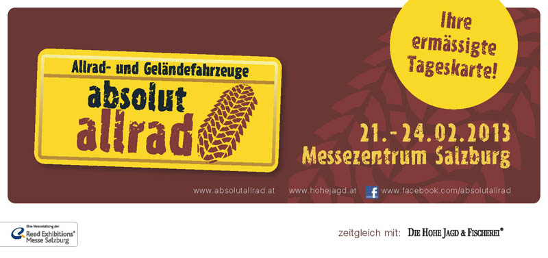 Diesen Termin sollten sich alle Allrad-Fans rot im Kalender anstreichen: vom 21. bis 24. Februar 2013 findet im Messezentrum Salzburg die „absolut allrad“ parallel zur „Hohen Jagd & Fischerei“ statt.