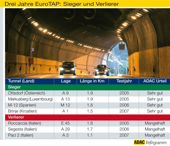 EuroTAP - European Tunnel Awards - Der ADAC kürt die sichersten Tunnel Europas und zieht damit Bilanz aus über 300 Tests in 20 Ländern23.01.2008 Sieg für die Sicherheit: „Markusberg“ in Luxemburg, „Ottsdorf“ in Österreich, „M-12“ in Spanien sowie „Brinje“ in Kroatien sind als beste Straßentunnel Europas der vergangenen drei Jahre mit den European Tunnel Awards ausgezeichnet worden. Die Trophäen wurden von ADAC-Präsident Peter Meyer im Rahmen der EuroTAP Abschlussveranstaltung in der Bayerischen Vertretung in Brüssel den siegreichen Tunnelbetreibern sowie Vertretern aus der Politik der jeweiligen Siegerländer überreicht. Für mehr Sicherheit in den europäischen Straßentunneln hat der ADAC gemeinsam mit elf weiteren Automobilclubs und der Unterstützung der EU-Kommission im Jahr 2005 das Programm EuroTAP (European Tunnel Assessment Programme) ins Leben gerufen. Innerhalb von nur drei Jahren haben Tester mehr als 150 Tunnel überprüft und sind dabei mehr als 125 000 Kilometer durch Europa gereist. Insgesamt wurden seit Beginn der ADAC-Tunneltests im Jahr 1999 bereits 300 Röhren in 20 Ländern gecheckt.