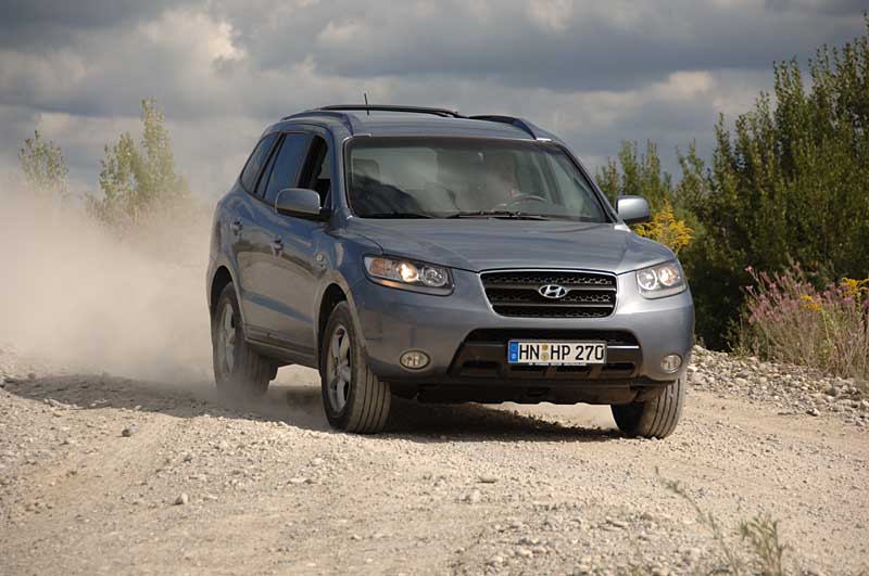 Cruiser auf koreanisch - Hyundai Santa Fe 2.2 CRDi 4WD Automatik12.09.2006 Ein sanfter Turbodiesel, kombiniert mit einer ebenso sensibel arbeitenden Automatik – eingebaut in ein weich gefedertes Viermetersiebzig-SUV, das mit allem erdenklichen Luxus ausgestattet ist: Da muss zwangsläufig eine gelassene Fahrweise die Oberhand bekommen und sich ein entspanntes Gefühl des Cruisens einstellen. Im Frühjahr dieses Jahres präsentierte Hyundai auf der AMI in Leipzig dem deutschen Publikum erstmals die Zweitauflage des Santa Fe. Europäischer im Design war das erfolgreiche Korea-SUV geworden, mit neuem Motor und überarbeitetem Fahrwerk auf dem technisch aktuellen Stand und vor allem größer, so dass nun bis zu sieben Personen in ihm reisen können. Mit seinen 4,68 Metern Länge übertrifft der neue Santa Fe seinen Vorgänger um 18 Zentimeter und auch in der Höhe (1,8 m) und Breite (189 cm) ist er gewachsen, dringt so in die Klasse der großen SUV vom Kaliber der Mercedes M-Klasse oder des VW Touareg vor. Dieser Klasse angemessen ist auch das Platzangebot im Santa Fe: Die groß dimensionierten Vordersitze bieten Langstrecken-Komfort par excellence, könnten allenfalls etwas mehr Seitenhalt bieten, und auch auf der groß dimensionierten Rückbank lässt es sich bequem reisen, ohne unter einem Mangel an Kopf- oder Beinfreiheit zu leiden.