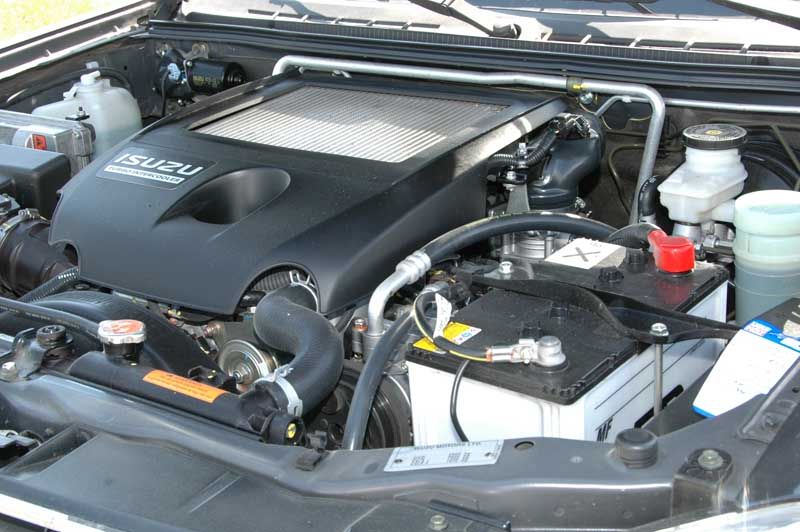 Moderne Zeiten haben hinter dem markanten gestylten Gesicht mit hochkantigen Scheinwerfern und großem Kühlergrill sowie der charakteristischen Lufthutze auf der Motorhaube Einzug gehalten: Hier arbeitet ein kernig tönender Vierzylinder-Turbodiesel mit Common-Rail-Direkteinspritzung, zwei obenliegenden Nockenwellen und vier Ventilen pro Brennraum. Das 2,5-Liter Triebwerk stampft bereits ab Leerlaufdrehzahl kräftig los und zieht, wenn man es flugs und ohne Verhaspeln durch das lasterhaft langwegige Fünfgang-Menü der Schaltkulisse schafft, ohne Turboloch durch. Um die Ohren mit einer angenehmen Akustik zu verwöhnen und das optimale Kraftpotenzial des Aggregats stets zu nutzen, richtet sich der D-Max'ler kommod zwischen 2.000 und 3.000 Umdrehungen ein – stehen ihm hier doch auch die 280 Newtonmeter Maximaldrehmoment jederzeit zur Verfügung. Schaltfaule freut's, für den Zwischenspurt reicht in der Regel ein beherzter Tritt aufs Gaspedal.