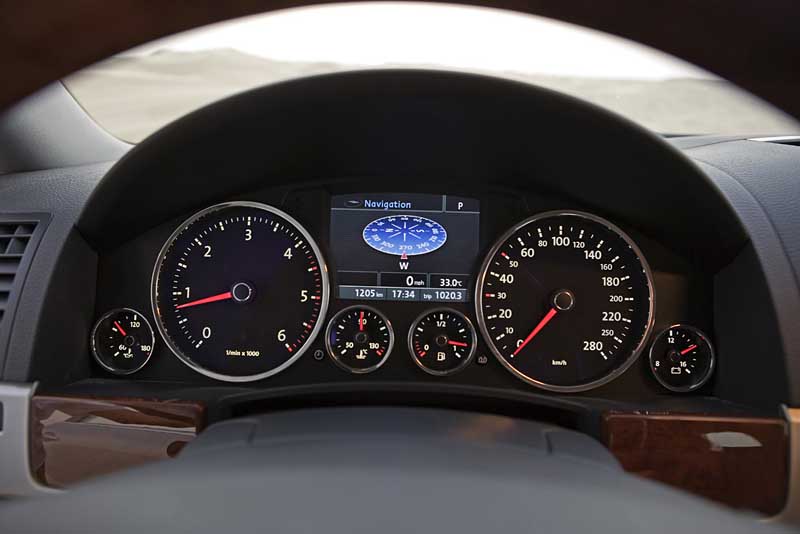 Frisch aufpoliert - Fahrbericht: VW Touareg V8 FSI - Seite 2Außen ist die zweite Generation des Touareg an der überarbeiteten Front mit neuem Kühlergrill, modifizierten Stoßfängern und neu gestalteten Scheinwerfern zu erkennen. Die geänderten Außenspiegel fallen dagegen wohl nur intimen Touareg-Kennern auf – sie verbessern jedoch im Zusammenspiel mit dem überarbeiteten Dachkanten-Spoiler am Heck die Aerodynamik. Außerdem sind in die Spiegel die Warnleuchten des neuen Side-Scan-Spurwechselassistenten integriert. Ein rein optischer Gag findet sich schließlich noch am Heck des neuen Touareg: Die Rückleuchten erstrahlen nun in „LED-Optik“ – also mit konventionellen Glühbirnen, denen eine Lochmaske die LED-Optik verleiht. Im Innenraum fielen die Modifikationen noch geringer aus: Das größere