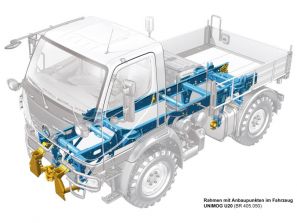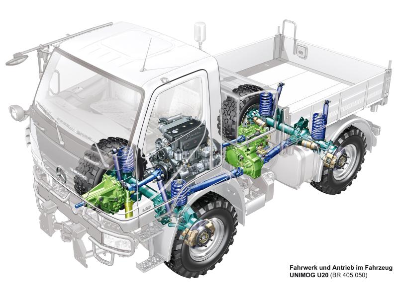 Und genau für diesen Einsatz ist auch der U 20 bestens gerüstet. Wie seine größeren Schwestermodelle der Baureihen U 300 bis 500 und U 3000 bis 5000 hat er alles an Bord, was einen Extrem-Geländegänger ausmacht. Das Rückgrat des U 20 bildet ein massiver Leiterrahmen, an dem die schraubengefederten Portalachsen mit Einzelbereifung aus dem Unimog-Baukasten hängen. Ein permanenter Allradantrieb mit manuell sperrbarem Zentraldifferenzial sowie zwei Achssperren sorgen auch beim Einstiegsmodell U20 für die Unimog-typische Geländegängigkeit.
