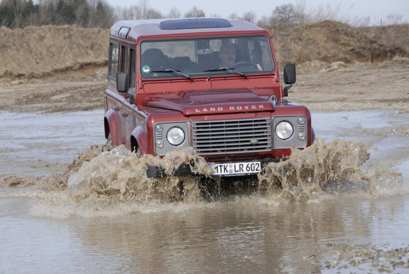 Land Rover Defender 110 TD4 Station Wagon – Oldie but Goodie / Seite 3Mit reichlich Tempo 130 – da bremst die Elektronik den Defender sanft ein – und einer moderaten Drehzahl von rund 2.800 Touren lassen sich auch lange Autobahnabschnitte stressfrei absolvieren. Dauer-Vollgas ist also kein Problem, schließlich liegt die Nennleistung von 122 PS/90 kW erst 700 Kurbelwellenumdrehungen später an: Das weit gespreizte Sechsgang-Schaltgetriebe sorgt somit für ein Motor schonendes Drehzahlniveau einerseits und für moderate Verbrauchswerte andererseits: Selbst bei Vollgasfahrt auf der Autobahn schluckte der Defender 110 im Test gerade mal 12,4 Liter Diesel auf 100 Kilometer, im gemischten Betrieb war es knapp ein Liter weniger. Dass der Straßenbetrieb eher zu den Pflichtübungen des Defender 110 gehört, teilt er seinen Passagieren unaufgeregt aber deutlich mit. Ein Geräuschniveau von 77 Dezibel bei Höchstgeschwindigkeit ist nicht gerade leise, das Fahrwerk macht keinen Hehl daraus, dass unter dem Defender zwei schwere Starrachsen stets in Bewegung sind, und wer mal voll in die Eisen muss spürt schnell, dass eine bewegte Masse von bis zu 3.050 Kilogramm (maximal zulässiges Gesamtgewicht des 110) mächtig schieben kann.