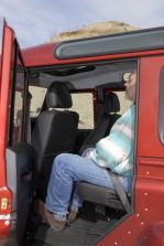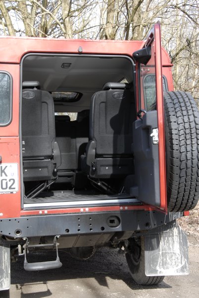 Bis zu sieben Passagiere kann der Defender 110 befördern. Dabei sitzen die drei in Reihe zwei aufrecht und genießen ein großzügiges Raumgefühl. Lediglich die Beinfreiheit leidet darunter, dass die Zehen nicht unter die Vordersitze gestellt werden können. Das ist auf den beiden serienmäßigen Klappsitzen im Fond besser, doch dafür ist die Kopffreiheit geringer und die Radkästen zwingen hier zu einer schrägen Sitzposition – sie stehen dem jeweiligen „Fensterfuß“ im Weg.