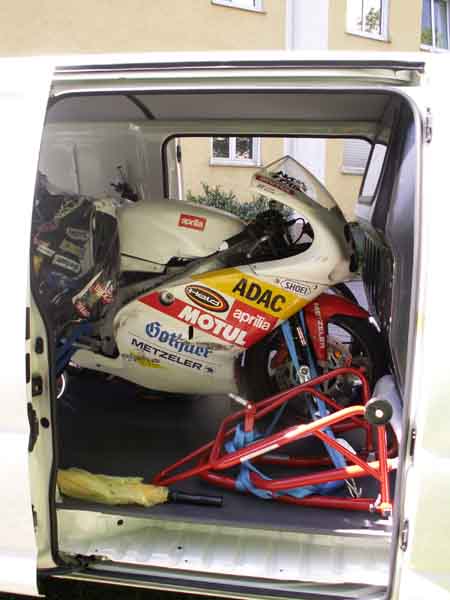 Denn das kann schnell mal passieren, der große Laderaum und fast 1.000 Kilo Zuladekapazität verführen eindeutig dazu. Klar, waren wir davor nicht gefeit: Auffahrrampe an die mit 56 Zentimeter wirbelsäulenschonend niedrige Ladekante – und dann rein mit dem 118-Kilo-Cup-Rennerle. Beim Fixieren des Motorrades via Spanngurten an den im Boden fest verankerten Verzurrösen freuen wir uns über die zusätzliche Zugriffsmöglichkeit durch die linke Schiebetüre. Sie erleichtert anschließend auch das weitere Beladen mit den Werkzeug- und Ersatzteilkisten, den Reifen und Spritkanistern sowie allem anderen Equipment.