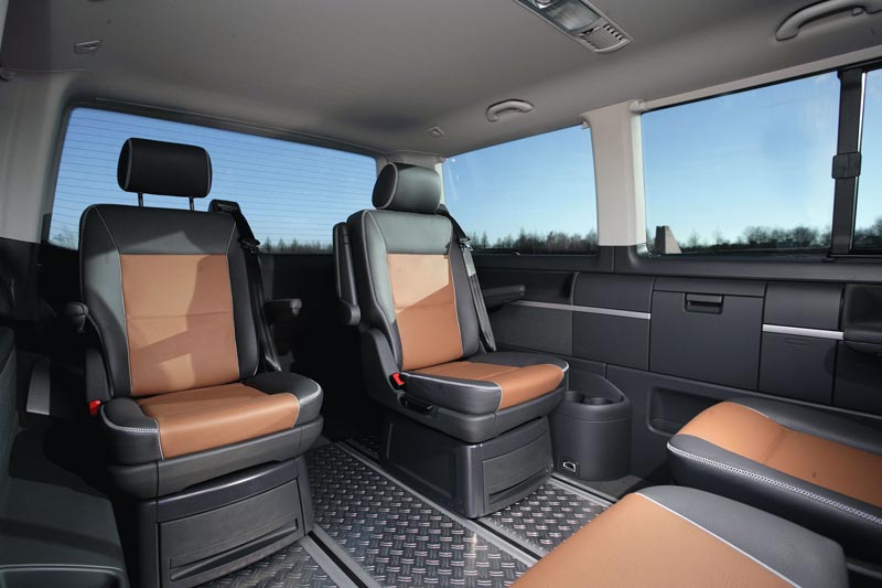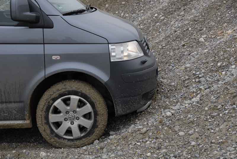 Volkswagen T5 2,5 TDI PanAmericana 4motion – Lässig Globetrottern – Seite 2Weiter im Gelände: Ausgefahrene Spurrillen, dazwischen aufgeworfene Erdhügel – und das mit einem VW „Bus“? Na gut, ab Werk baut der T5 Multivan 4motion schon mal 20 mm höher als sein Pendant mit Frontantrieb. Für 11.495 Euro legt Peter Seikel noch mal 30 mm drauf – macht zusammen 25 Zentimeter Bodenfreiheit für den „PanAm“. Mit im Preis sind außerdem griffige GoodYear Wrangler AT/R der Dimension 235/70, aufgezogen auf 6 x 16 Zoll Leichtmetallfelgen im rustikalen 7-Speichen-Design. Ein Unterfahrschutz vorne (für Ölwanne und Getriebebox) rundet das Package ab, mit dem der T5 zum Globetrotter-Bus fürs Grobe wird, der hier so manchem martialischer daher kommenden SUV den Schneid nimmt. Nächste Session: Sand. Auch hier zeigt der PanAmericana sich gerüstet, kommt mit seinem Drehmoment und der elektronisch geregelten Haldex-Kupplung auf und über die leichte Düne. Der Wall vor dem Anstieg ist dank der 37 Grad Böschungswinkel kein Problem, der glatte Alu-Unterfahrschutz schiebt da ein wenig Sand vor sich her. Dass der Bauch beim Abwärtsweg leicht über den Untergrund schabt, verwundert aufgrund des langen Radstandes nicht weiter – obwohl der T5 mit 18 Grad einen besseren Rampenwinkel aufweisen kann als so manches Kompakt-SUV. Gleiches gilt für den hinteren Böschungswinkel: Da zeigt sich der T5 4motion PanAmericana dank Seikel-Fahrwerk mit 26 Grad talentierter als beispielsweise BMW X3 (22°), Audi Q5 oder Mercedes GLK (jeweils 25°). In puncto Platz- und Komfortangebot übertrifft er Sport Utility Vehicle wie diese in seiner Eigenschaft als Bus ohnehin: Im „PanAm“ dürfen sich die vier Passagiere im Fond auf bequemen, lederbezogenen Einzelsitzen mit Armlehnen räkeln. Die beiden Sessel in der zweiten Reihe lassen sich nicht nur längs verschieben, sondern auch drehen – wir kennen das vom „normalen“ Multivan.