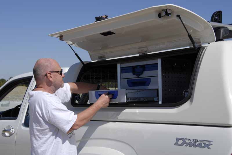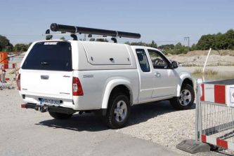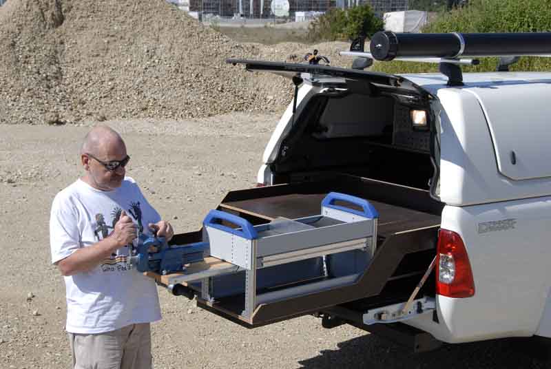 Wertvolle Inhalte wollen und sollen diebstahlsicher verwahrt sein – ärgerlich und teuer, wenn Werkzeuge oder Ersatzteile in langfingerige Hände geraten. Hier bieten die serienmäßigen Schlösser in den mitunter hakeligen Kunststoff-Drehgriffen der Seitenklappen und dem Heckfenster keinen wirklich effektiven Schutz, sie lassen sich von Profis mühelos knacken. Road Ranger listet das in Wagenfarbe lackierte, rund 70 Kilo schwere und aus GFK gefertigte Hardtop mit immerhin 3.368 Euro auf – ein Preis, für den man sich dann doch etwas hochwertigere Verschlussmechanismen wünscht.