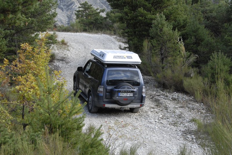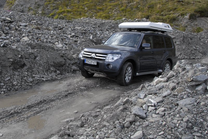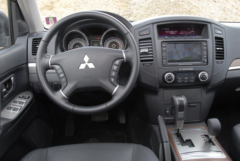 Mit diesem „echten“ Permanent-Allrad inklusive Untersetzung ist der Mitsubishi-Offroader für grobe Geländeausflüge gerüstet – auch deshalb, weil die weiteren Geländewerte stimmen. Das Fahrwerk verschränkt ordentlich und schlägt auch bei groben Bodenverwerfungen nicht durch. Bodenfreiheit und Böschungswinkel sind in Relation zu den Abmessungen (Länge 4,9 Meter, Radstand 278 cm) okay, für steile Bergabfahrten steht eine Bergabfahrhilfe parat, und in Extremfällen kann auch noch das Hinterachsdifferenzial manuell zu 100 Prozent gesperrt werden.