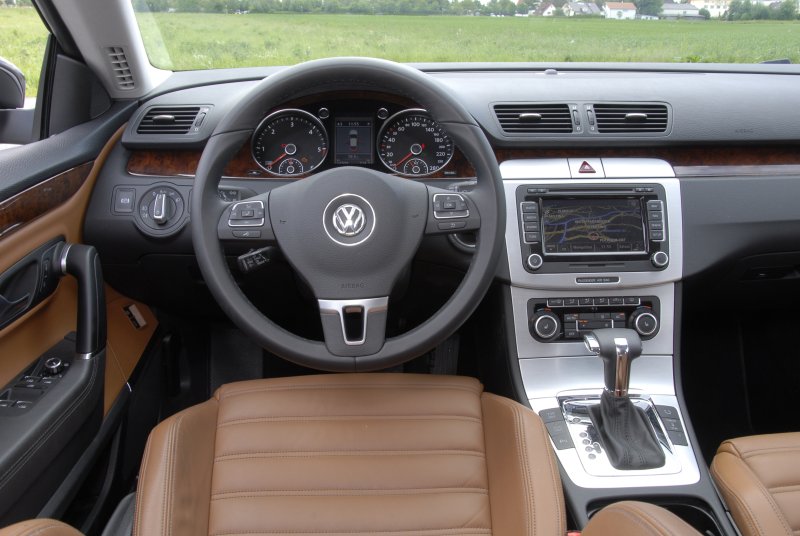 Das war's aber dann auch schon mit den Coupé-typischen Nachteilen. Fahrer & Co lassen sich auf bequemen Sportsitzen nieder, die effektiven Seitenhalt vermitteln. Der Blick schweift über eine Armaturenlandschaft, die von Holz- und Alueinlagen geprägt ist. Das abgesteppte Leder der Sitzflächen trägt zusätzlich dazu bei, dass Oberklassen-Ambiente im Passat CC aufkommt. Weniger standesgemäß: Die Neigung des Fahrersitzes lässt sich in dessen manueller Ausführung nicht verstellten – dafür bedarf es schon der optionalen elektrischen Sitzverstellung für gut tausend Euro.