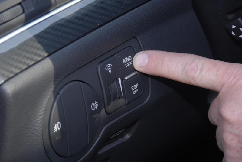 Die Motorkraft leitet der automatische Allradantrieb des iX55 im Normalfall an die Vorderachse, bei auftretenden Traktionsproblemen beteiligt eine elektromagnetisch betätigte Mehrscheibenkupplung am Hinterachsdifferenzial die Hinterräder mit maximal 50 Prozent am Vortrieb. Über einen Druckschalter links unten am Armaturenbrett lässt sich darüber hinaus der Längsausgleich deaktivieren (4WD Lock) und das ESP abschalten.