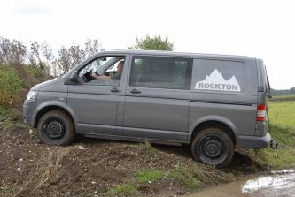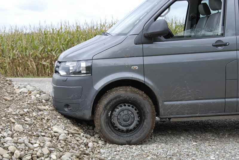 Ja, der T5 Rockton Expedition hat das grobe Talent dafür und das mögen wir nun ausprobieren. Jetzt also den Zündschlüssel gedreht und los geht's. Locker treibt der „kleine“ 2,0-TDI das leer knapp 2,4-Tonnen wiegende Gefährt voran, was natürlich auch zum Großteil den kurzen Getriebeübersetzungen zu verdanken ist. Wer da übrigens einen großen Drehzahlsprung zwischen dem dritten und vierten Gang erwartet, wird angenehm überrascht: Die Anschlüsse passen, der Rockton legt eine kontinuierliche Beschleunigung auf das Asphaltparkett. Geht es durch kurviges Geläuf, erfreut er mit einer angesichts der flankenhohen Räder vergleichsweise präzisen Lenkung sowie einer trotz des 2,07 hohen Aufbaus geringen Wankneigung. Den straffen Stabilisatoren sei Dank.