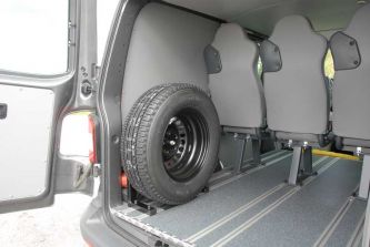 Die sich dann allerdings im Gelände etwas gegen eine brauchbare Verschränkung sträuben. Dennoch kraxelt der Rockton im unteren Drehzahlbereich gemächlich kraftvoll über den Parcours, schafft bis zu 33 Prozent Steigung. Und wo's hakt, drückt man den Knopf für die Hinterachssperre, schaltet das ESP ab und vertraut zudem auf die effizient arbeitende Schlupfregelung. So kommt man fast überall dort durch und ans Ziel, wo auch kernige Geländewagen durch- und hinkommen. Der unschlagbare Vorteil des T5 Rockton Expedition dabei ist eben: Man kann auf gut 2,33 Meter Laderaumlänge (und einer Höhe von rund 1,40 Meter) einiges an puristischen Genussmitteln mitführen. Dass der Verzicht auf Luxus seinen Preis hat, ist bei VW eh' klar: Rund 50.570 Euro darf man für einen rein zweckmäßig ausgestatteten T5 Rockton Expedition schon ausgeben.