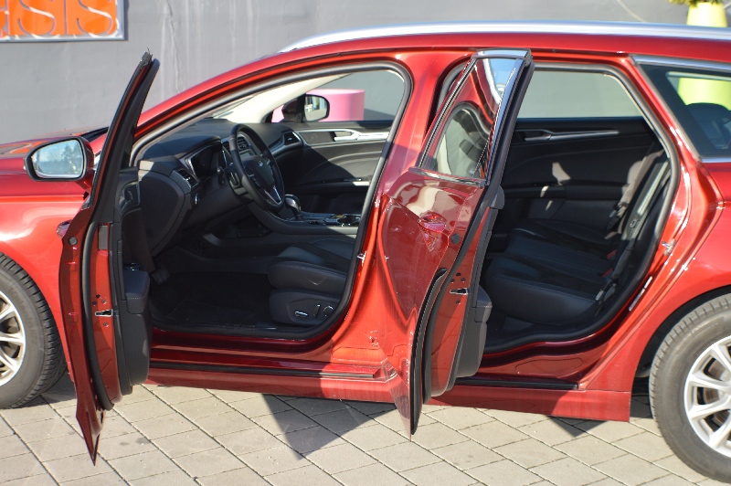 Ford Mondeo Titanium Turnier 2.0 TDCi AWD – Perfect Understatement15.04.2016 Irgendwie guckt er ja ein wenig böse und aggressiv aus seinen schmalen Schweinwerferaugen. Wirkt damit auf den ersten Blick mit seinem Breitmaulgrill fast ein bisschen wie jene britische Raubkatze, deren Markenlogo einst zum Ford-Konzern gehörte. Dennoch scheucht die Mondeo-Front mit den dem variablen Kühlerlufteinlass den Vorfahrer auf der linken Spur nicht fluchtartig nach rechts. Na gut, dann lehnen wir uns jetzt einfach entspannt in den Fahrersitz zurück und warten gelassen darauf, den 180 Dieselpferden erneut die Allradantriebs-Sporen geben zu können, sobald die Asphaltbahn vor uns wieder frei ist. Eben noch sportlich schnell, jetzt komfortabel cruisend. Unterwegs im Ford Mondeo Titanium Turnier 2.0 TDCi AWD. Wir waren auf der Suche nach dem perfekten Allrad-Reise-Kombi. Und das mit knapp 50.000 Euro Budget. Ob wir da fündig wurden, fragen Sie? Ein Blick in das Angebot von Ford Deutschland weckte preis-/leistungsverlockende Begehrlichkeiten in Gestalt dieser vielversprechend komplett ausgestatteten Mondeo-Version: mit dem Titanium-Paket, dem 180 PS starken Zweiliter-Common-Rail-Turbodiesel in Kombination mit der „PowerShift“ genannten 6-Gang-Automatik und einem permanenten Allradantrieb mit variabler Kraftverteilung. Der Händler ruft dafür aktuell 48.250 Euro inklusive Mehrwertsteuer auf. Wie fair und fahrspaßintensiv ist dieses Angebot? Erste Antwort: Fair in puncto Sitzplatz- und Gepäckraum-Angebot. Auf fast 4,87 Meter vom vorderen Stoßfänger bis zur Heckklappe verteilen sich der quer eingebaute Vierzylinder-Turbodiesel, zwei ergonomische Sitze vorne, eine lobenswert beinfreiheitliche Bank hinten sowie mindestens 488 Liter Volumen für das Gepäck von idealerweise vier Personen. Fahrer und Beifahrer bewegen sich beim Einsteigen auf Kollisionskurs mit der aerodynamisch angeschrägten A-Säule. Aber einmal unbeschadet drin im Vordersitz, fühlt man sich wohl.
