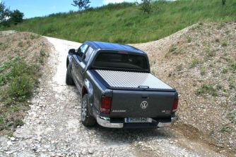 Für einen ersten Ausflug ins Gelände stand der Amarok mit Top-Motorisierung, 8-Stufen-Wandlerautomatik und Pemanent-Allrad zur Verfügung. Erstaunlich, wie weit dieser vom Antriebslayout deutlich straßen-orientierte Amarok auch ohne Untersetzung kommt. Mit seinen 550 Newtonmeter Drehmoment bei 1500 Touren – das sind immerhin 130 Nm mehr als beim Vorgänger – wühlt er sich mit hoher Durchzugskraft bei niedriger Geschwindigkeit durch Dick und Dünn, dabei geht ihm selbst an den steilsten Auffahrten nie die Puste aus. Gleichzeitig sorgt das zentrale Torsen-Differential für eine bedarfsgerecht-variable Verteilung der Vortriebskraft zwischen Vorder- und Hinterachse, ausgehend von einem Standard-Verhältnis von 40:60 Prozent.