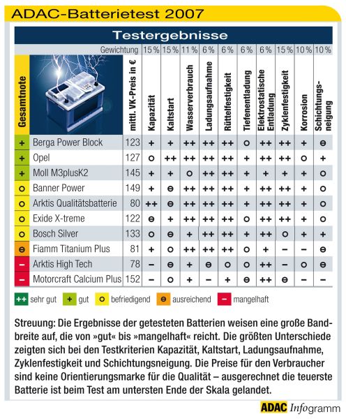 ADAC-Batterietest - Hoher Preis keine Garantie für Qualität25.10.2007 Große Qualitätsunterschiede hat der ADAC bei einem Test von zehn Fahrzeugbatterien festgestellt. Neben drei „guten“ Batterien gab es zwei „mangelhafte“ und ein breites Mittelfeld mit viermal „befriedigend“ und einmal „ausreichend“. Schlecht für die Verbraucher: Am Preis kann man sich beim Kauf einer Ersatz-Batterie nicht orientieren, denn die teuerste (Motorcraft Calcium Plus) war auch die schlechteste. Bei dem vom ADAC zusammen mit europäischen Partnerclubs und der Stiftung Warentest durchgeführten Test konnten nur drei Batterien überzeugen: die Berga Power Block, die Original-Ersatzteilbatterie von Opel und die Moll M3plusK2. Untersucht wurden im Test zehn Kriterien, die Auskunft geben über die Leistungsfähigkeit der Batterie, die Haltbarkeit und die Sicherheit. Vor allem auf das Kaltstartverhalten (Testsieger Opelbatterie), die Kapazität, also das Speichervolumen der Batterie (Arktis Qualitätsbatterie) und auf die Zyklenfestigkeit (fünfmal „sehr gut“) wurde mit 45 Prozent Gewichtung besonderes Augenmerk gelegt. Unter Zyklenfestigkeit versteht man die Fähigkeit der Batterie, möglichst viele Lade- und Entladevorgänge zu verkraften. In der Praxis liefert dieser Wert einen wichtigen Hinweis auf die Langlebigkeit einer Batterie.