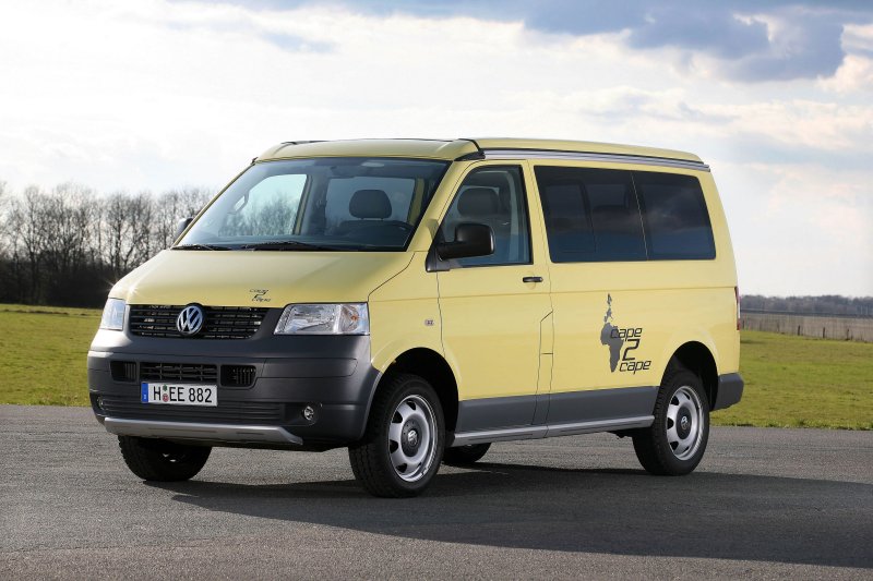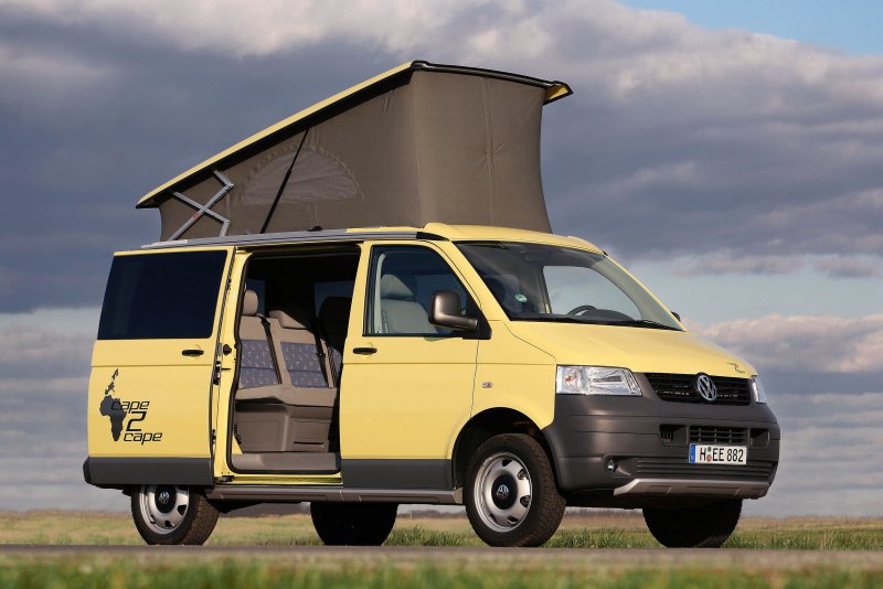 Mit dem Cape2Cape auf Basis des California Beach mit manuellem Aufstelldach nimmt Volkswagen Nutzfahrzeuge den Globetrotter-Gedanken auf – inspiriert durch die 24.000 Kilometer lange, neunwöchige Tour des Extremsportlers Joachim Franz, die am Nordkap begann und in Kapstadt endete und von fünf gelben California Beach begleitet wurde.