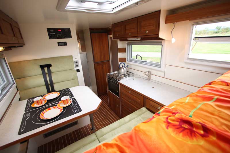 Bocklet Fahrzeugbau: Dakar 630 auf Iveco Daily – Premiere in Bad Kissingen / Seite 2Direkt hinter der Fahrerkabine angeordnet und für den Zweipersonen-Betrieb ausreichend groß sind die Sanitärzelle mit integrierter Dusche, Waschbecken und Kassetten-Toilette sowie ein Kleiderschrank. Ein großer Stauraum für das Reiseequipment findet sich direkt unter dem Heckbett, er ist von außen via einer Serviceklappe auf der rechten Kabinenseite zugänglich. Die Bordtechnik ist ganz auf Expeditionscharakter ausgelegt: Der Frischwassertank fasst üppige 230 Liter, der Abwassertank 130 Liter – beide sind frostsicher im Innenraum montiert und beheizt. Für die autarke Stromversorgung hat Bocklet der 220 Ah-Aufbaubatterie mit dem automatischen Ladegerät (12V/50A) und dem 1,2 kW-Wechselrichter eine 330 Watt-Solaranlage zur Seite gestellt. Als solide und ausreichend motorisierte Basis dient der neue Iveco Daily 4x4 (55S 18W) mit einem Radstand von 3.400 mm. Der 3,0-Liter Vierzylinder Common-Rail Turbodieselmotor leistet 130 kW / 176 PS und generiert mit 400 Nm Drehmoment ausreichend Kraft. Sie wird via einem 6-Gang-Getriebe sowie einem Verteilergetriebe mit Splitter und Geländereduktion auf alle vier Räder übertragen. Damit stehen insgesamt 24 Vorwärtsgänge und vier Rückwärtsgänge zur Verfügung. Für schweres Gelände lässt sich zusätzlich je eine Differenzialsperren an der Hinterachse (serienmäßig) sowie an der Vorderachse (Aufpreis) aktivieren. Der Basispreis für den komplett ausgesatteten Bocklet Dakar 630 liegt bei 162.500 Euro. |