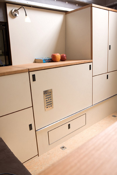 Orangework Stephan Schmidt – Land Rover Defender Wohnmobil: Debüt in Bad Kissingen11.05.2009 Frisch zur „Abenteuer & Allrad“ in Bad Kissingen (11. bis 14. Juni) präsentiert Fernreisemobil-Spezialist „Orangework“ aus Köln einen expeditionstauglichen, komplett ausgebauten Camper auf Basis des Land Rover Defender 110. Der britische Geländewagenklassiker wird von vielen Individualreisenden gerne als Basisfahrzeug für Aus- und Umbauten genutzt. Und so lag es auch für Spezialist Stephan Schmidt nahe, sich den Defender 110 für einen umfassenden Innenausbau vorzunehmen: Unter dem Motto „Platz ist in der kleinsten Hütte“ entwickelte das Kölner Orangework-Team ein Set aus Möbelmodulen, mit denen sich der Land Rover in ein vollwertiges Wohnmobil für zwei Personen verwandelt. Hier lässt es sich dann je nach Bedarf schlafen, kochen, essen, sitzen und waschen: „Tisch, Spülbecken, Zweiflamm-Kocher oder Toilette – alles kann verschwinden und mit einem Handgriff wieder hervorgeholt werden,“ erläutert Konstrukteur Stefan Schmidt. Die Möbel sind aus beschichtetem Pappelsperrholz mit Massivholz-Anleimer gebaut. Stauraum für Geschirr, Bevorratung und Urlaubsequipment ist in den diversen Schränken ausreichend vorhanden. Für die Lebensmittel ist eine 40 Liter große Kompressor-Kühlbox installiert, der Frischwassertank fasst 75 Liter, zehn Liter stehen als Reserve zur Verfügung. In kalten Nächten und an frischen Tagen wärmt eine Airtronic-Standheizung von Eberspächer, die Stromversorgung übernehmen eine 140 Ah-Gel-Batterie sowie ein 100 Watt-Solarpanel. Als zusätzlichen Clou präsentiert Schmidt ein Weinregal für „das gemütliche Candlelight-Dinner“. Neben dem Land Rover Defender 110-Ausbau wird Orangework auf seinem Stand in Bad Kissingen auch je einen Ausbau auf Mercedes Sprinter 616 sowie MAN KAT 1A1 präsentieren. |