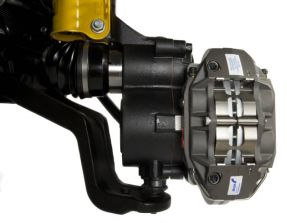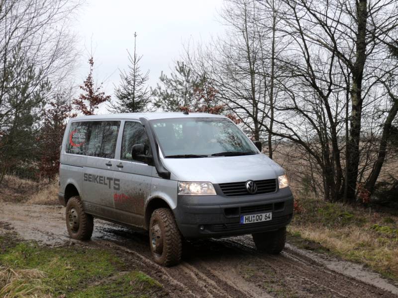 Zunächst einmal muss der Fahrer klettern: Um am Volant des SEIKEL T5 "extreme" Platz zu nehmen gilt es, das Bein deutlich höher auf die Trittstufe zum Cockpit zu heben als man das vom konventionellen Volkswagen T5 4motion gewohnt ist. Aufgrund des von Peter Seikel umkonstruierten Fahrwerks mit Einzelradportalen an Vorder- und Hinterachse ist das Chassis gegenüber dem Serienmodell um gut 23,6 Zentimeter in die Höhe gewachsen.