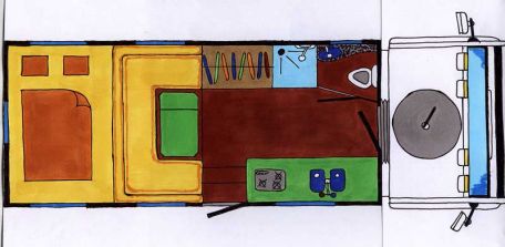 Wohnaufbau: Dach und Wände: GfK-Sandwich-Bauweise mit 56 mm Isolierung aus PU-Schaum, Boden: 3-mm-GfK-Unterboden, 56 mm Isolierung aus PU-Schaum und 12-mm-Innenboden mit PVC-Belag, Einstieg über Außentreppe, Einstiegtür und Stauklappen aus Wandmaterial, Fenster einschlagsicher und doppelt verglast (Eigenfertigung), Dachausstiegklappe, Sicherheitsschlösser mit Einschlüsselsystem, Durchstieg zum Fahrerhaus 70 x 50 cm mit verschließbarer Tür, isolierter Faltenbalg außen, vier Unterflurstaukästen, Dieseltank-Schutzvorrichtung aus Alu-Riffelblech, schwenkbarer Reserveradträger am Heck, Astabweiser über Kabine, Dachträger auf Fahrerhaus, Motorradgarage mit elektrischem Lift im Heck, Befestigung der Kabine auf dem Chassis durch Zwischenrahmen und Pendellager