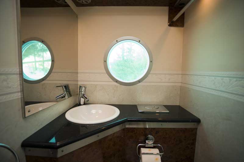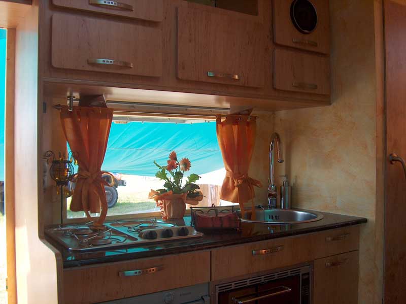 C.R.S. Labrador – Der Andersartige - Seite 4In Wagenmitte stehen sich die Duschkabine und der Waschraum samt Keramik-Toilette gegenüber. Vorn ist auf der linken Seite die Vierer-Gegensitzgruppe auf einem Podest angeordnet. Gegenüber schließt sich das Küchenmöbel mit Dreiflamm-Gaskocher, Backofen, Spüle und Kühlschrank an. Den Durchstieg ins Fahrerhaus deckt eine massive Platte ab, die man als Verlängerung der Küchen-Arbeitsfläche herausnehmen kann. Nicht festgelegt hat sich Nösch bei seinem Vorführfahrzeug auf die Platzierung des Reserverades: Es kann entweder unterflur, am Heck oder neben Aluboxen oder Weithalskanistern auf einem Dachträger montiert werden, je nach gewünschter Tankkapazität. Eines aber steht für Anton Nösch fest: Jedem Käufer schenkt er eine Labrador- und eine Unimog-Kollektion plus einen Unimog-Fahrerlehrgang für zwei Personen.