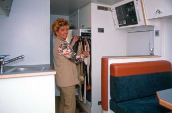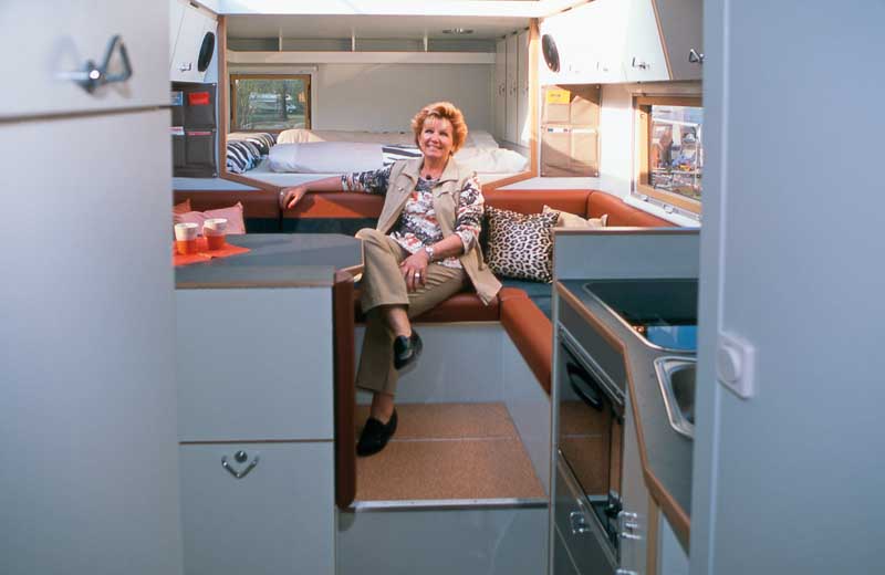 Ungewöhnlich ist der Grundriss mit der großzügig dimensionierten Winkelsitzgruppe, die das Ehepaar auf ihrer Reise für Gespräche und Interviews nutzen möchte. Um den Platz dafür in der längenbeschränkten Kabine heraus zu schinden, haben die zukünftigen Besitzer auf einen frei stehenden Kühlschrank verzichtet. Den ersetzt eine 100 Liter fassende, von Langer & Bock mit Waeco-Bauteilen gefertigte Kompressor-Kühlbox in der vorderen Sitztruhe.