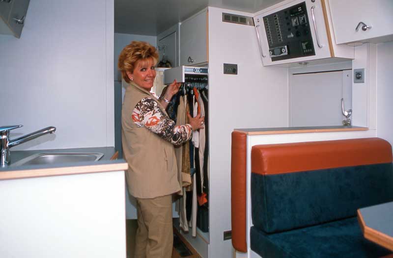 Zur Versteifung der Kabine sind die tragenden Innenwände – die Sitztruhen, die Bettauflage und die beiden Nassräume – aus drei Zentimeter dicken GfK-Sandwichplatten geschnitten und eingeklebt. Die Möbel, vollflächig über Aluwinkel mit den Wänden verbunden, sind aus Pappelsperrholz mit robuster Deckschicht geschreinert.