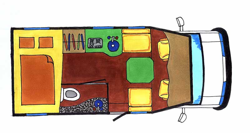 Wohnaufbau: Dach und Wände: GfK-Sandwich-Bauweise mit 55 mm Isolierung aus Pu-Schaum, Boden: einlaminierter Stahlleiterrahmen, 3-mm-Gfk-Unterboden, 70 mm Isolierung aus PU-Schaum und 12-mm-Innenboden mit PVC-Belag, Tragrahmenprofile mit Fahrerhausboden verbunden, Aufbaubefestigung durch verwindungsfreie Doppel- Dreipunktlagerung, Einstiegtür und Klappen aus Wandmaterial, Fenster doppelt verglast, Einstieg innen liegend, Sicherheitsschlösser mit Einschlüsselsystem, absenkbarer Motorrad- und Fahrradträger am Heck