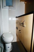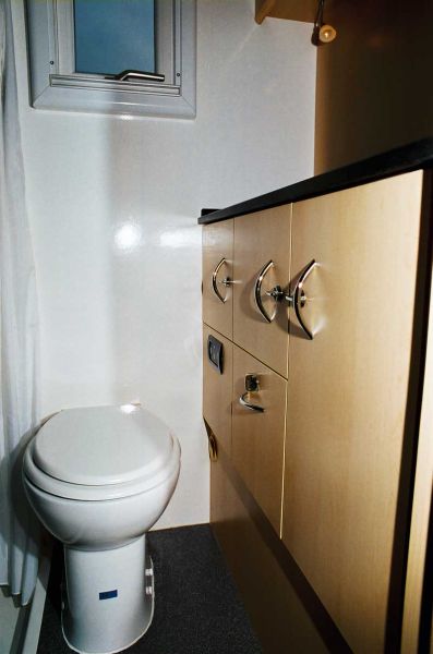 Auf der rechten Fahrzeugseite schließt sich die zweiteilige Nasszelle an den Einstieg an. Die ist komplett ausgestattet: Im Waschtisch, rustikal mit Kunststeinoberfläche gestaltet, ist ein Becken aus Chromstahl eingelassen. Daneben findet sich eine Keramik-Spültoilette, ein Heizkörper zum Handtuch-Trocknen und die Dusche mit einer Edelstahl-Tasse. Durch je ein Dach- und ein Außenfenster gelangen Licht und Luft in den Hygieneraum.