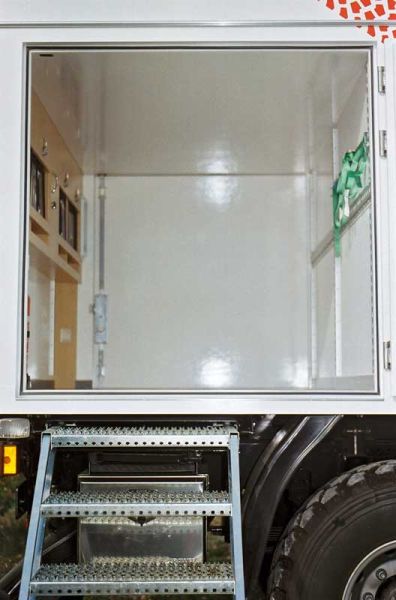 Im Fahrerhaus ist das allradgetriebene Service-Reisemobil mit zwei Navigationssystemen, Rallye-Tripmaster, Kompressor-Kühlbox und Rückfahrvideosystem ausgestattet. Außen  umschließen Astabweiser aus Edelstahl den Wohnaufbau und das Fahrerhaus. Der Überbau auf dem Fahrerhaus trägt zusätzliche Dach- und einen Suchscheinwerfer sowie das Reserverad, das mittels Kran herunter gelassen bzw. nach oben gehievt wird. Rundum sorgen Arbeitsleuchten für ausreichende Helligkeit während der Servicearbeiten. Seitlich am Rahmen sind die Gel-Batterien und der  Stromgenerator untergebracht.