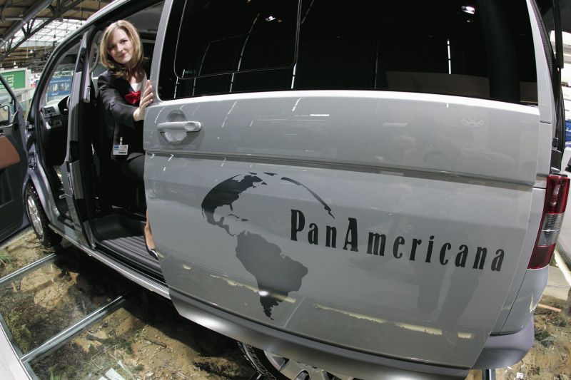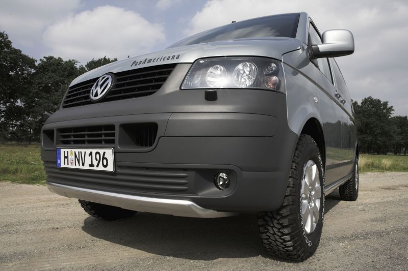 Vier Premieren stehen bei Volkswagen Reisemobile auf dem Stand beim Caravan-Salon (24.8.-2.9.2007) in Düsseldorf - Seite 4Zwei Rekordfahrten auf der Strecke zwischen Alaska und Feuerland stehen namentlich Pate für die in Düsseldorf gezeigte Studie Multivan PanAmericana. Mit einem serienmäßigen Frontspoiler und Seitenschwellern sowie einer Schwellerbeklebung wirkt der PanAmericana robust und den Vorkommnissen eines eventuellen Geländeeinsatzes gewachsen. Abgedunkelte Rückleuchten unterstreichen das exklusive Offroad-Outfit, während der Schriftzug auf der Schiebetür mit der Karte des amerikanischen Kontinents Auskunft über seine namentliche Herkunft gibt.