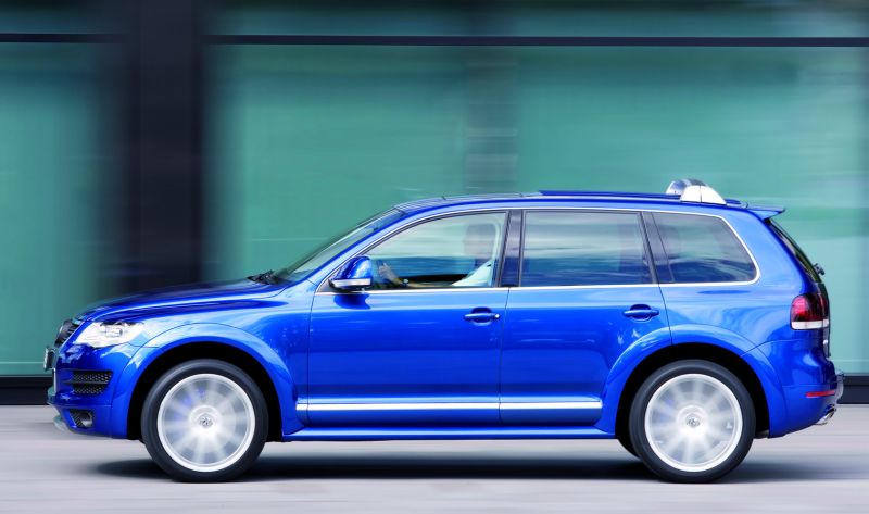 Der Touareg R50: Der V10 TDI Motor entwickelt 350 PS Leistung und 850 Newtonmeter Drehmoment - Seite 2Dem Leistungspotenzial des R50 entsprechend, konzipierte Volkswagen Individual gemäß der R-Philosophie eine neue Ex- und Interieur-Ausstattung. Von außen ist der neue Touareg R50 leicht an seinen 21-Zoll-Leichtmetallrädern des Typs Omanyt mit 295er Reifen, blau lackierten Bremssätteln, dezenten Radhausverbreiterungen, Seitenschwellern, eigenständigen Stoßfängern (Sport-Design-Paket) und einem modifizierten Kühlergrill (Chrom in einem Matt-Finish) zu erkennen. Exklusiv für den Touareg R50 gibt es die Außenfarbe „Biscay-Blue“. Blautöne dieser Art sind seit der Vorstellung des ersten Golf R32 im Jahre 2002 typisch für die leistungsstarken R-Modelle. Alternativ werden für den Touareg R50 die vier Lackierungen „Campanellaweiß“, „Reflexsilber“, „Black Magic“ und „Atacamgrau“ angeboten. Zur umfangreichen Ausstattung gehört zudem ein Luftfeder-Sportfahrwerk: Das sogenannte „Fahrdynamikpaket mit adaptivem Wankausgleich“ und zwanzig Millimeter abgesenktem Fahrwerk ergänzt dabei den Modus „Sport“ der manuell oder automatisch regulierbaren Luftfederung um eine härtere Federrate.