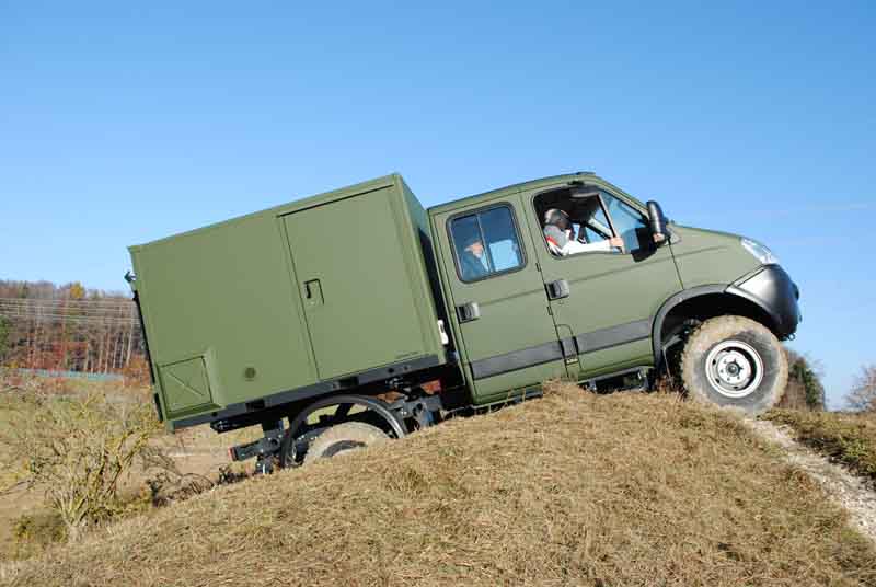 Iveco Daily 4x4 2012: Mehr Kraft auf alle Viere / Seite 2Das Biturbo-Prinzip überzeugte bei ersten Probefahrten auf dem Iveco-Testgelände Markbronn in einem 5,0-Tonner Doppelkabiner-Fahrgestell mit Kofferaufbau: Ab rund 1.200 Umdrehungen legt das Aggregat mit einem beeindruckend kontinuierlichem Schub los, der bis etwa 3.600 Touren auf dem Drehzahlmesser nicht abreißt. Gute Voraussetzungen also, um anspruchsvolle Geländeformationen zu meistern: Mit eingelegter Untersetzung kraxelte das Bundeswehr-Fahrzeug unter anderem mühelos über eine einfache, wenn auch nicht übermäßig anspruchsvolle Bergauf- und Bergabpassage. Ebenfalls neu in der Daily-Motorenpalette sind zwei zusätzliche Leistungsversionen des Drei-Liter-Triebwerks, die von jeweils einem Turbolader mit variabler Schaufelgeometrie und Wastegate beatmet werden: Sie leisten 170 PS (125 kW) bzw. 146 PS (107 kW) und verfügen über ein Drehmoment von 400 Nm bzw. 350 Newtonmeter. Ein weiterer Neuzugang ist der 2,3-Liter große Vierzylinder Diesel mit der jüngsten, „Multijet II“ genannten Generation des Iveco-Common-Rail-Systems, die mit maximal acht Einspritzungen pro Zyklus arbeitet. Dieses Triebwerk ist mit 106 PS (78 kW) und 270 Nm oder 126 PS (93 kW) und 320 Nm Drehmomentmaximum zu haben. Fahrer von 4x4-Dailys, die als Expeditionsmobil mit Spezialaufbauten in hitzeintensiven Regionen eingesetzt wurden, werden sich angesichts allzu oft anspringender und dann tosender Lüfterventilatoren über das neue Kühlerkonzept freuen: Es soll vor allem dank einer optimierten Führung des großen Luftzuführungsschachtes im überarbeiteten Daily-Gesicht für eine um 30 Prozent effizientere Kühlung sorgen. Allerdings wird dieses Facelift für den Daily 4x4 erst später im Jahr nachgereicht, die 2WD-Versionen tragen es ab sofort. Im Cockpit darf sich der Daily-Fahrer unter anderem über neu gestaltete, übersichtlichere Instrumente, griffigere Fensterheberschalter sowie vor allem eine kleinere, ergonomischere Schalthebelkonsole freuen: Das Knie ist nun nicht mehr anschlaggefährdet, der Durchstieg bequemer. Und durch die Verlegung der Bowdenzug-Steuerung hat sich der Schaltkomfort spürbar verbessert. Ein weiterer Pluspunkt ist das in der Längsachse weiter verstellbare Lenkrad. |