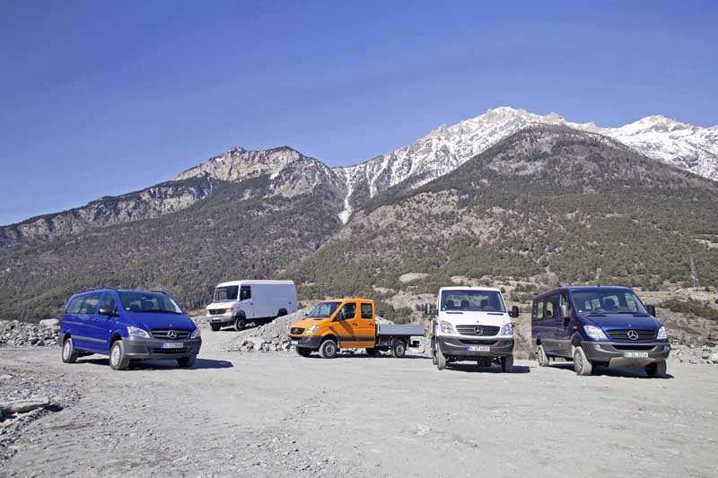 Mercedes-Benz Vans: Allrad-Offensive mit Viano, Vito, Sprinter und Vario07.04.2011 Allrad fürs Feine, Praktische und Grobe – mit den 4x4-Varianten der Baureihen Viano, Vito, Sprinter und Vario lässt die Van- und Transporter-Sparte von Mercedes-Benz ein breites Modellangebot von Multi-Purpose-Vehicle auf den Markt rollen. Der Fächer ist von der luxuriösen Großraumlimousine mit permanenten bis zum aufbauvariablen 7,5-Tonner-Leiterrahmen-Chassis mit zuschaltbarem Allradantrieb gespreizt. Die Palette der Dieselmotoren reicht vom Vierzylinder mit 95 kW (129 PS) im Vario 4x4 bis zum V6 mit 140 kW (190 PS) im Sprinter 4x4. „Nach den letzten harten Wintern verzeichnen wir deutlich höhere Bestelleingänge für unsere Allrad-Modelle,“ erläutert Nutzfahrzeugchef Volker Morhinweg die verstärkten Marketingaktivitäten in Sachen 4x4-Antriebsversionen. „Also wollen wir in diesem Sektor weiter wachsen.“ Die Vorzeichen stehen also gut und ihre Feuertaufe im Motorsport haben der Viano/Vito 4x4 und Sprinter 4x4 schon lange bestanden: In technisch nahezu serienmäßiger Ausführung setzte Mercedes-Benz sie bereits 2009 und 2010 erfolgreich bei der Rallye „Aicha des Gazelles“ in Marokko ein. In diesem Jahr konnte das Team Andrea Spielvogel und Anneke Voss mit einem Sieg in der Crossover-Klasse die Geländetalente und die Zuverlässigkeit des Vito 4x4 erneut unter Beweis stellten. Weniger rallyeambitioniert als bei der Aicha des Gazelles ging es dagegen bei der Fahrvorstellung der aktuellen Allrad-Palette zu: Um die Talente der einzelnen Vertreter der 4x4-Modellreihen anzutesten, hatte Mercedes-Benz Teile einer großen Kiesgrube präpariert. An Berauf- und in Bergabpassagen, bei einer Schrägfahrt, in einer Verschränkung, im Schlamm und bei einer Wasserdurchfahrt durften Vito 4x4, Sprinter 4x4 sowie Vario 4x4 ihre mehr oder weniger ausgeprägte Offroad-Eignung zeigen. Die Basisdaten für den Rallyeeinsatz waren durchaus vielversprechend – und sind es für den gemäßigteren Straßen- und Offroadbetrieb sowieso: In Viano 4matic und Vito 4x4 – der eine als luxuriöse Großraumlimousine, der andere als praktischer Kleinbus und Kastenwagen konzipiert – arbeiten identische Antriebsstränge und Dieselmotoren. Der Antrieb der vier Räder erfolgt via einem schrägverzahnten Verteilergetriebe, die Kraft wird in der Ausgangsverteilung zu 65 Prozent an die Hinter- sowie zu 35 Prozent an die Vorderachse. Anstatt via mechanischer Differenzialsperren wird die traktionsoptimale Umverteilung der Kraft über das elektronische System „4ETS“ geregelt, das Mercedes affine Allrad-Fans bereits aus der ML-Klasse kennen: Es ist Bestandteil des elektronischen Stabilitätsprogramms ESP und bremst jene auf einem schlupfigen Untergrund durchdrehenden Räder mit kurzen Impulsen ein. Was eben das Antriebsmoment an dem Rad (oder den Rädern) auf griffigerem Boden erhöht.