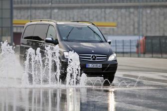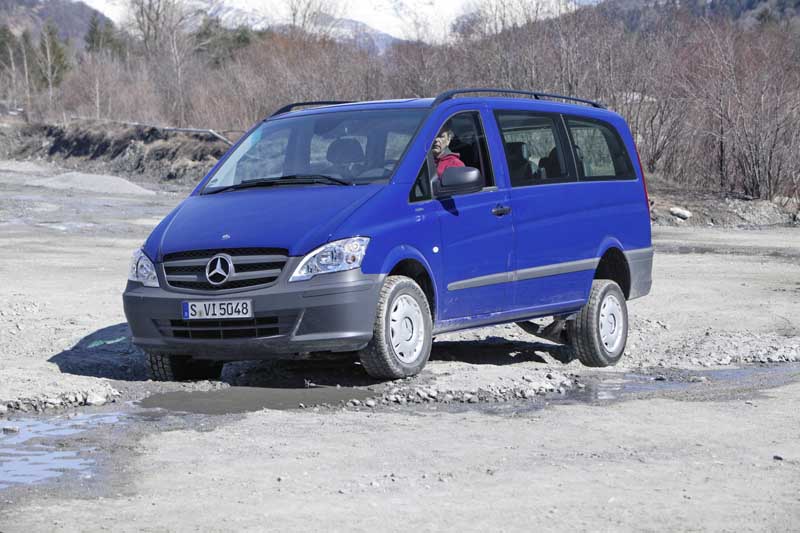 Mercedes-Benz Vans: Allrad-Offensive mit Viano, Vito, Sprinter und Vario / Seite 2Das erleichtert beispielsweise das Anfahren an einer teils nassen, verschneiten oder vereisten Steigung oder gestaltet prekäre Ausweichmanöver bei ebensolchen Straßenverhältnissen fahrdynamisch wesentlich unkritischer – wie sich bei ersten fahrpraktischen Eindrücken auf einem Sicherheitsparcours nachvollziehen ließ. Allerdings arbeitet das System mit einer merklichen Verzögerung und reagiert im Extremfall – wie bei drei schlupfenden Rädern – nur auf nachdrücklichen Gasbefehl. Für Fahrer von Wohnwagen- und Lastenanhängern interessant: Die mit dem „4ETS“ kombinierte Anhängerstabilisierung, die der Viano/Vito-Käufer als Beigabe mit der ab Werk georderten Kugelkopfkupplung bekommt. Sie bremst die Pendelbewegungen eines schlingernden Anhängers äußerst zügig wieder ein. Für den leichten Geländeeinsatz sind Viano 4matic und Vito 4x4 dank eines dezent höhergelegten Chassis gerüstet: Für die Vorderachse nennt Mercedes allerdings eine Bodenfreiheit von lediglich asphalttauglichen 150 mm, für die Hinterachse dagegen rund 210 mm. Der vordere Böschungswinkel beträgt bei allen Radständen 20 Grad, der hintere bei der Version mit kurzem Radstand und kurzem Überhang 28 Grad sowie 19 Grad beim langen Chassis. Auch mit dem Rampenwinkel von 19 Grad bei der kurzen Ausführung kann man sich im leichten Gelände akzeptabel bewegen, wie der Ausflug durch die Kiesgrube zeigte. Als Motorisierung stehen je ein 2.0- sowie 2.2-Vierzylinder-Common-Rail-Turbodiesel mit variabler Schaufelradgeometrie zur Wahl: Der eine 100 kW/136 PS, der andere 120 kW/163 PS stark – jeweils bei 3.800 U/min. Beide Triebwerke sind langhubig ausgelegt und präsentieren sich damit als durchzugsstark mit einem Maximaldrehmoment von 310 bzw. 360 Newtonmeter, das ab 1.400 bzw. 1.600 U/min anpackt. In puncto Kraftübertragung steht bei den Allrad-Versionen von Viano und Vito ausschließlich eine Fünfgang-Automatik mit manueller Schaltoption zur Verfügung. Der sechs- bis achtsitzige Viano 4matic ist in drei Karosserielängen – von knapp 4,77 bis 5,24 Meter – und zwei Ausstattungspaketen sowie als Freizeitmobil Marco Polo zu haben. Die Preisleiter beginnt bei 44.644,43 Euro. Der Vito 4x4, ebenfalls in den drei Längenversionen als Kombi, Mixto (mit Sitz- und Laderaum) und Kastenwagen zu haben, steht ab 33.911,43 Euro (inkl. MwSt.) in der Preisliste.