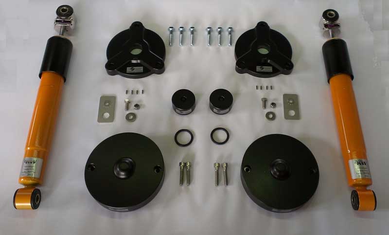 Diplom-Ingenieur Heiko Ernst hat dazu Formstücke aus hochfestem Aluminium konstruiert, mit denen er die vorderen Federbeine tiefer setzt und die Federn der Hinterachse von der Karosserie distanziert. Die Hinterachs-Schwingungsdämpfer werden durch längere Hochleistungspedants aus dem Hause KW ersetzt. „Wir haben die Komponenten so konzipiert, dass sowohl der originale Federweg als auch die Beugung der Antriebswellen an der Hinterachse beibehalten werden“ so Ernst.